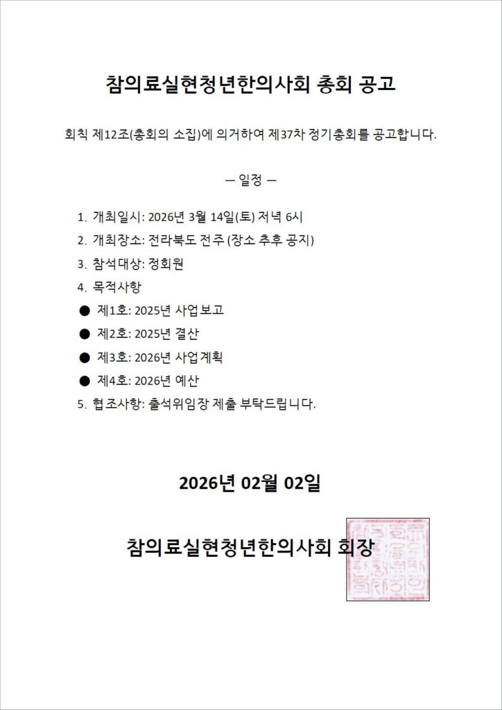 HOME > 공지 2026 02.02 2026 총회 공고 “공지” 카테고리 최근 글2025년 총회 및 선거 공고2024년 총회 공고2023년 총회 및 선거 공고2022년 청년한의사회 송년회제3회 기후위기 강연: 기후변화와 한약자원목록