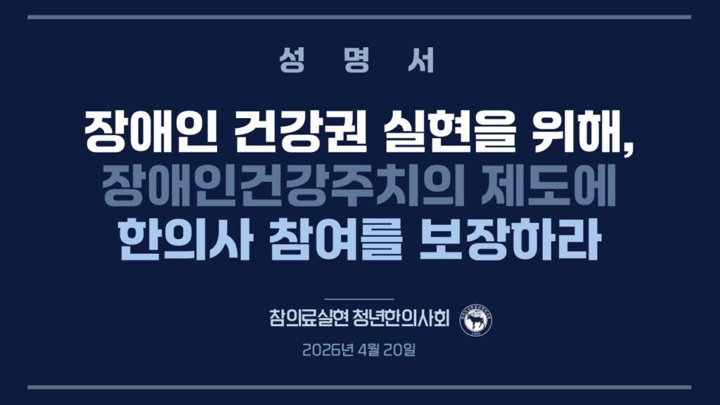 장애인들이 길거리에 나와 차별 철폐를 외치는 오늘, 우리는 다시 확인한다. 장애인의 건강권은 선별적 시혜가 아니라 보편적 제도로 실현되어야 한다. 참의료실현 청년한의사회는 장애인 당사자 및 장애인 운동과 함께, 장애인 건강권이 온전한 제도로 자리잡는 그 날까지 연대할 것이다.